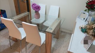 vendo mesa de comedor de madera maciza con cristal y las sillas que se ven en la foto. buen estado de conservacion. ideal meson restaurante o para restaurar dispongo del mueble del salon tambien tipo alacena. regalo ropa camilla verde a medida ver en mi perfil