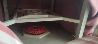 Conjunto de mesa camilla con tarima circular. - Tablero redondo - Tarima de madera con hueco central. - Patas de madera desmontadas.