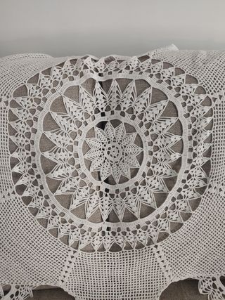 Vendo paño o tapete de ganchillo,hecho a mano con hilo de grosor medio. Tiene mucho trabajo como se puede apreciar, ya q lleva el centro y después 8 rosetones tejidos uno a uno individual. Es para camilla de 90cms o 1 metro para q los rosetones cuelguen. Lo tengo puesto en una mesa camilla de 1,05.