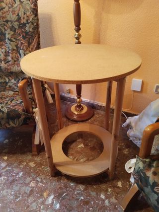 Mesa camilla redonda. - Diámetro de 60 cm. - Cubierta de cristal una de ellas. - Incluye su mantel de tela como se ve en la foto.