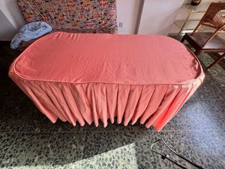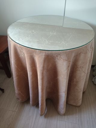 Mesa camilla con cristal y ropa camilla , hecha a medida . Tela facil para quitar manchas y es una tela muy buena . Guarda y mantiene el calor. Color Rosa Palo. lleva cristal