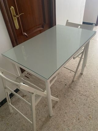 Mesa y cristal Puede usarse tanto como mesa camilla, mesa para cocina o como escritorio. El cristal es una adaptacion de una mesa mas grande pero no se aprecia ya que los bordes estan acabados SILLAS NO, YA ESTAN VENDIDAS