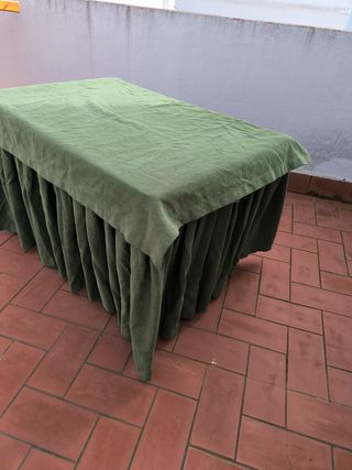 Mesa pequeña de hierro en verde y vestida con tapete, y a juego otra ropa igual pero para mesa más grande. Con 3 cojines a estrenar ver sin ningún compromiso. El jarrón no entra en el lote. La ropa camilla mesa grande 30€ total conjunto de las dos 70€