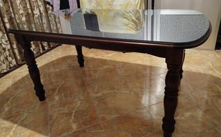 Mesa de madera maciza con seis sillas a juego, ropa camilla y cristal medidas 120x75x75. Con marcas y algunos roces