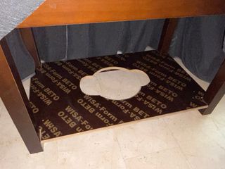 Tarima rectangular de madera para mesa camilla y brasero. Cuenta con un diseño práctico y funcional. Abertura circular central de 32 cm para brasero. Encajan perfectamente las 4 patas de la mesa (abertura de 6 cm) y no se mueve nada. NO HAGO ENVÍOS. GRACIAS!!