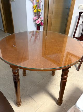 Mesa camilla con sobre de cristal y base de madera. - Diseño redondo. - Patas de madera torneada. - Tiene pocos signos de desgaste por el tiempo. NO SE HACEN ENVÍOS, SE RECOGE EN MÁLAGA CAPITAI🙏🏼