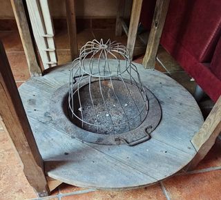 Mesa camilla con brasero eléctrico. Medidas: 60cm diámetro 75cm altura - Brasero con rejilla metálica y base de plástico. - Estructura de madera. - Potencia de 400W. -Falda a medida buena tela para las cuatro estaciones.