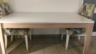 Mesa de comedor de color blanco y beige, está en muy buen estado, hace 90 de ancho y 160 de largo extensible a 207cm.