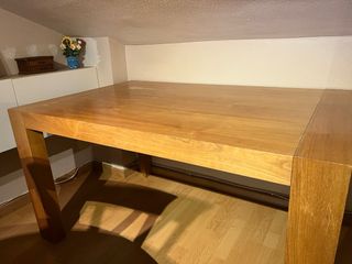 Mesa de comedor rectangular con un diseño moderno y funcional. Ideal para salón o salas de reuniones o fiestas. Mesa muy vivida, tiene daños estéticos pero reparables si te gusta la restauración. Sigue siendo segura y fuerte. Se puede extender en dos veces cada extensión es de 40 cm. Por lo que la mesa sin extender mide 140cm, puede ser de 180 cm y llega hasta 220cm. Caben sentandos ubos 14/16 comensales bien. Escucho ofertas, me urge venderla. - Acabado en madera natural, nogal americano. - Extensible para mayor capacidad.