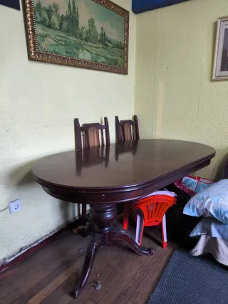 Elegante y cómoda mesa de comedor con un diseño clásico acabado en madera oscura, ideal para comidas familiares. Utilizada solamente durante tres años.
