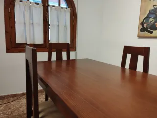 Conjunto de mesa grande de madera maciza con 6 sillas a juego. Posibilidad de 1 silla más. Mesa espaciosa rectangular Medidas de la mesa: Largo 1,80 ancho 82 Altura . El precio es del conjunto entero. Urge por mudanza!!!! Recogida al lado de Camarena (Toledo)