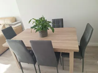 Conjunto de mesa de comedor con 6 sillas. - Mesa con superficie de madera color roble. - 6 sillas con tapicería de polipiel gris. - Medidas de la mesa: 140x90cm. - Posee dos extensibles que hacen que pase a 218x90cm. Interesa vender en pack, no preguntar por sillas sueltas y demás, gracias.