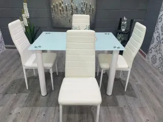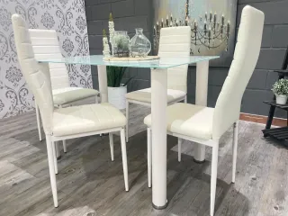 Nueva mesa de cristal con 4 sillas blancas de polipiel hacemso envios a domcilio Pago contre reembolso