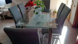Vendo 6 sillas de comedor con la mesa a juego. Tanto las sillas como las mesas están en muy buen estado. La mesa sin extender mide 1,30 metros y es para 6 comensales y con el extensible mide 1,90 metros y da para 8 comensales.