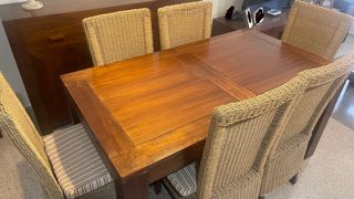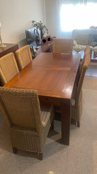 Conjunto de mesa de comedor de madera con seis sillas de ratán. - Mesa de madera con acabado natural (160 de largo x 90 de ancho x 78 de alto) La mesa permite ampliarse de largo hasta 200. - Seis sillas de ratán (104cm respaldo de alto x 50 de alto del asiento x 50 de ancho x 52 de profundo) - Aparador (160 de largo x 40 de profundo x 110 de alto) - Librería (190 de alto x 90 de ancho x 35 de profundo) - Mesa de cetro (120 de largo x 70 de ancho x 45 de alto) - Mesita auxiliar (70 de alto x 40 de ancho x 40 de largo) NO SE ENVIA SOLO PARA RECOGER