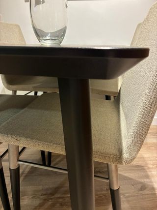 Elegante mesa de comedor con un diseño moderno. - Tablero de madera con acabado bicolor. - Patas de metal negro y 4 sillas tapizadas con tela antimanchas,en perfecto estado urge vender REBAJADA SOLO FIN D SEMANA 230 EUROS!!!