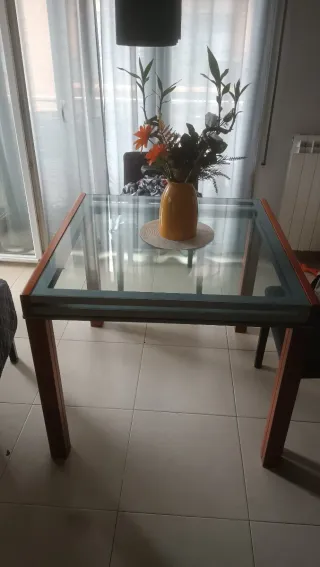 Mesa de comedor con superficie de cristal y estructura de madera. - Es extensible se hace doble.
