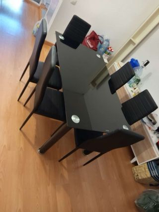 Conjunto de mesa de comedor con sobre de cristal y seis sillas. La mesa se puede ampliar para hacerse más grande y amplia. Se puede comprar en conjunto o por separado. Según la compra se ajustará el precio. - Mesa con patas metálicas. - Sillas tapizadas en polipiel negra.