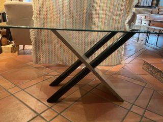 Elegante mesa con superficie de cristal y estructura de metal. - Diseño moderno y minimalista. - Patas metálicas robustas. Se puede quitar las patas para su traslado.