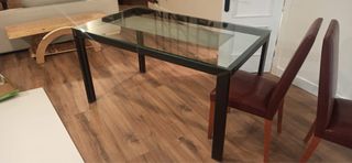 Elegante mesa de comedor con una combinación de materiales que le da un toque moderno. - Tablero de cristal. - Estructura de madera. Tiene el cristal un pequeño roto en la esquina como se aprecia en una de las fotos.