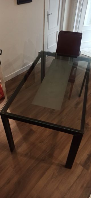 Elegante mesa de comedor con una combinación de materiales que aportan calidez y modernidad. - Tablero de cristal. - Estructura de madera. Es extensible y la madera es muy buena. Tiene una esquina del cristal roto.