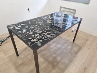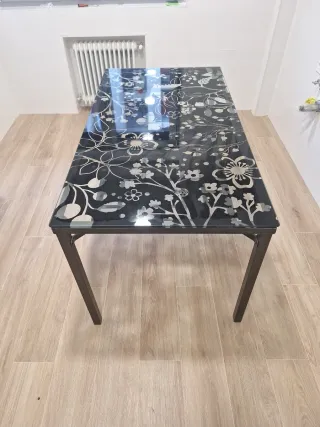 Mesa de comedor con patas de forja y encimera de cristal con estampado floral. 150cm x 80 cm 76 cm alto