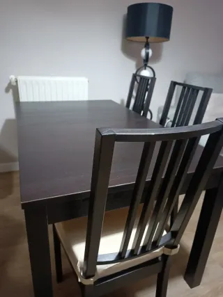 Conjunto de mesa de comedor extensible con conjunto de 4 sillas. - Mesa con acabado en madera oscura. La mesa extendida mide 2'17metros. Está en buen estado de conservación, solo tiene un pequeño desconchón en una pata. - Sillas con asientos en tela roja. Se nota que tienen uso, incluidas en el precio de la mesa.