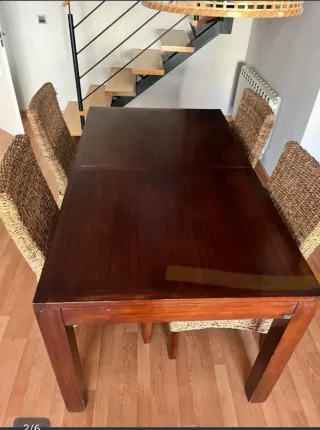 Mesa de 110 Extensible a 145 + 6 Sillas MADERA MACIZA Tanto la mesa como las sillas son de madera maciza, nada de aglomerados ni melamina. ... Se entrega desmontada (4 tornillos) para facilitar el transporte. Tiene las marcas normales de uso de cualquier mesa. (Solo las sillas nos costaron 120€ cada una) Precio total 6 sillas + mesa 300€.
