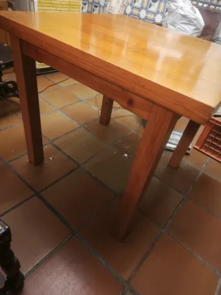 Mesa de comedor extensible fabricada en madera de pino macizo. Su diseño es robusto y funcional. - Tablero de madera maciza. - Patas de madera maciza. - Extensible para mayor capacidad.En el tablero de la mesa tiene un pequeño desconchado