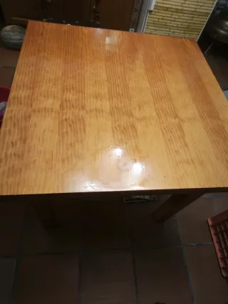 Mesa de madera vintage con estructura de madera oscura. Ideal para espacios reducidos. Se pliega para ahorrar espacio. - Medidas aproximadas: 120cm x 60cm (cerrada). - Perfecta para darle un toque rústico a tu hogar. - Presenta algunas señales de uso, pero en buen estado general.