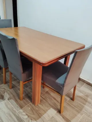 Conjunto de comedor con mesa de 90x90 y 4 sillas. La mesa es extensible hasta 90x130 Apenas se ha usado por ser de segunda vivienda y es de excelente calidad.