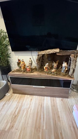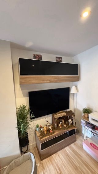 Muebles de salón comedor compuesto por los módulos que se aprecian en la fotografía más un módulo de vitrina que va colocado en la parte superior y dos estantes con lejas estrechas que van a los laterales (ver última foto). Son muebles macizos. Mesa extensible con seis sillas las cuales tienen la tapicería impecable.tv y decoración no incluido
