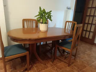 Medidas de la mesa: • Cerrada: Largo 134 cm • Abierta: Largo 204 cm • Ancho: 90 cm Mesa ideal para comedor o salón, con capacidad para 4 personas (cerrada) y hasta 6-8 personas (abierta). Incluye cuatro sillas a juego. Perfecta para espacios que requieren flexibilidad en el tamaño de la mesa. Solo ofrezco el conjunto completo, no se vende por piezas individuales. Precio negociable.
