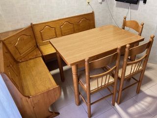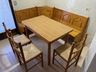 Conjunto de mobiliario de cocina de madera, ideal para un rincón. - Banco esquinero de madera. - Mesa de comedor a juego.medidas alto 76 , ancho 69, largo 110, abierta (2 alas) 170 - Tres sillas de madera con asiento de esparto sintético.