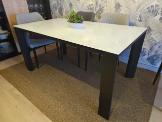 Mesa de comedor extensible de la marca Ikea, modelo BJURSTA. Su diseño moderno y funcional se adapta a diferentes espacios. - Acabado en color blanco. - Madera maciza con acrílica pintada. Dimensiones IKEA BJURSTA extensible (modelo 22177) Altura: 74 cm Ancho (profundidad): 90 cm Longitud: Cerrada: 140 cm Con una extensión: 180 cm Con las dos extensiones: 220 cm 6 Sillas GENRIKSDAL con funda, 4 con patas de efecto roble, 2 con patas blancas, estructura en estado impecable. 2 de color beige, 4 de color verde turquesa. La mesa por separado: €95 6 sillas por deparado: €220 Todo juntos: €295