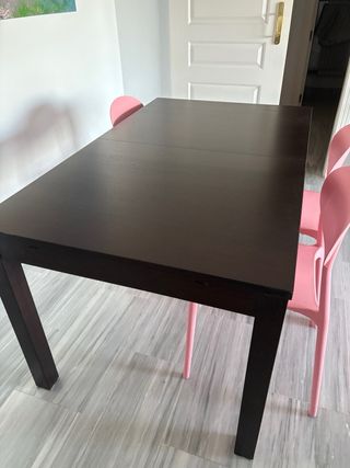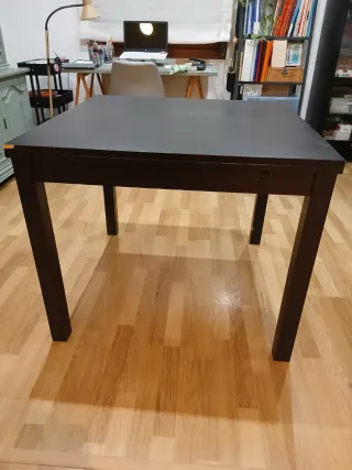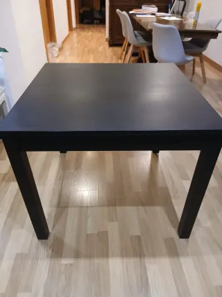 Mesa de comedor extensible de IKEA, color marrón oscuro-negro, en buen estado (tiene un pequeño desconchón en una pata y en una esquina del tablero pero ya arreglado); medidas extendida del tablero: 90x168 cms.Desmontable.