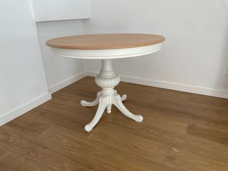 Elegante mesa redonda con base restaurada y tapa de madera, extensibles a 130cm. - Diseño extensible. - Acabado en blanco y madera natural.