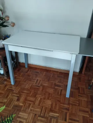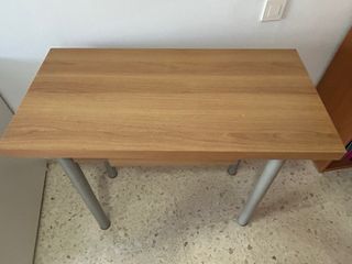 Mesa auxiliar con un diseño moderno y funcional. - Tablero de madera de color cerezo. - Patas de madera de color gris. - Cajón integrado para almacenamiento. - Se abre el tablero para aumentar el espacio. - Tiene algunos desperfectos por el uso, pero está bien conservada. MEDIDAS: - Tablero: cerrado 90 x 45 cm (abierto 90 x 90 cm) - Altura: 77,5 cm Se escuchan ofertas EN MI PERFIL ENCONTRARÁS MÁS OFERTAS INTERESANTES. ¡VISÍTALO!