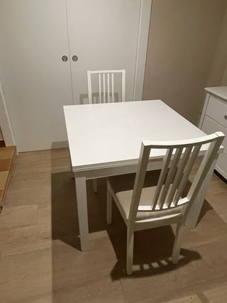 Conjunto de mesa de comedor Ikea extensible y dos sillas a juego. Están en buen estado. Tiene dos lados a extender de 39 cm cada uno. -Medida mínima: 90cm x 90cm x 74cm. - Medida extendida al completo: 168cm x 90cm x74cm. - Mesa de comedor extensible. - Acabado en color blanco. - Incluye dos sillas
