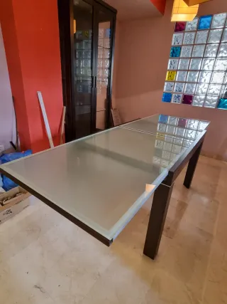 Elegante mesa de comedor con un diseño moderno y funcional. Perfecta para cualquier hogar. Medidas: - cerrada 140 - abierta 230 - ancho 90 - altura 78 - Tablero de cristal. - Estructura de madera. - Extensible para mayor capacidad. La mesa se se encuentra desmontada para mayor comodidad en su transporte.