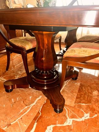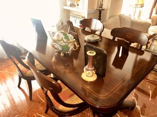 Elegante mesa de comedor de madera maciza - Diseño clásico y refinado. - Acabado en tonos marrones con 4 sillas tapizadas - Capacidad de 6 personas ampliamente - Extensible caben hasta 10 Estado nuevo (salón sin uso) Tendría que confirmar medidas.
