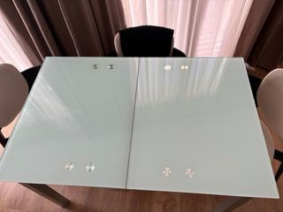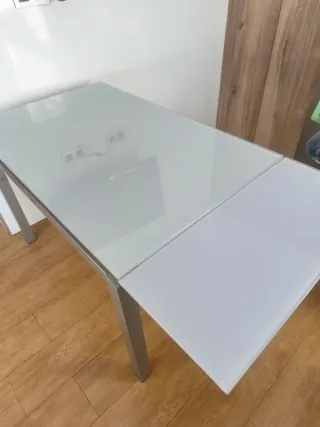 Elegante mesa de comedor con superficie de cristal y patas de metal cromado. Cerrada: 120x80cm / abierta 1: 150x80cm / abierta 2: 180x80cm. Tiene signos de uso pero está muy bien. - Diseño extensible para adaptarse a tus necesidades. - Acabado brillante en la tapa de cristal. - Patas de metal con acabado cromo.