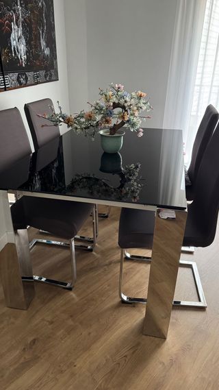 Elegante mesa de comedor con superficie de cristal negro y estructura de metal cromado. Su diseño moderno aportará un toque sofisticado a tu hogar. Díselo extensible para adaptarse a sus necesidades. -Medidas cerrada: 120x80. Abierta una hoja: 150x80 Abierta dos hojas: 180x80. - Diseño contemporáneo. Acabado brillo en el cristal. - Patas de metal pulido, con acabado cromo. Signos de uso en el cristal, pero con muy buen estado.