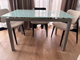 Mesa de comedor con superficie de cristal y estructura de madera. Con 4 sillas a juego. No tiene desperfectos Extendida mide 180 - Diseño moderno y funcional. - Acabado en tonos beige y transparente.