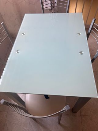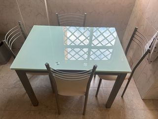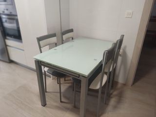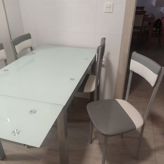 Se vende mesa de cocina de cristal templado con estructura metálica en color gris, extensible. Medidas cerrada: 110 x 70 cm. Medidas abierta: 170 x 70 cm, ideal para 6 comensales. Incluye 4 sillas a juego, muy cómodas y en buen estado, con estructura metálica y asiento acolchado. Conjunto en perfecto estado de uso, sin golpes ni roturas, listo para usar. Perfecto para cocina o comedor pequeño gracias a su tamaño compacto y al sistema extensible que permite ganar espacio cuando hay invitados. Precio del pack: 120 € (no se venden por separado).