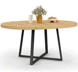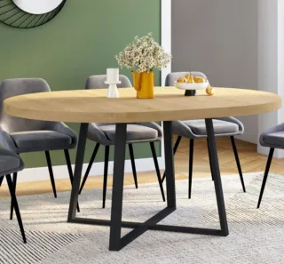 Elegante mesa de comedor con un diseño moderno y funcional. Su forma ovalada y la combinación de materiales le dan un toque distintivo a cualquier espacio. Nueva , sin usar ,en su embalaje. - Tablero de madera enchapado con acabado natural. - Base de metal negro con estructura cruzada. - Extensible para adaptarse a tus necesidades.