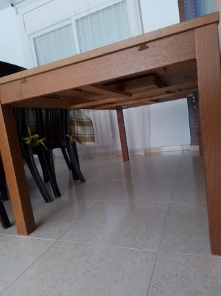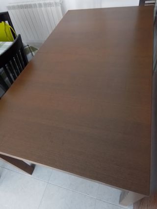 Mesa comedor + 6 sillas Mesa de comedor en muy buen estado, color madera oscura, con capacidad para 6 personas mínimo. Extensible hasta capacidad para 8 personas. Se incluye el conjunto completo con 6 sillas metálicas de respaldo y asiento cómodo. Ideal para comedor o cocina amplia, estilo moderno y funcional. Se vende por cambio de decoración. No se hacen envíos.