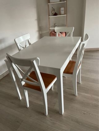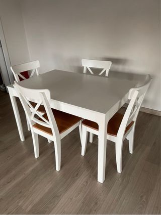 Mesa IKEA EKELADEN, color blanco, en buen estado general. 💎 Extensible de 120 cm a 180 cm (ideal para 4–6 personas). Tiene una pequeña picada superficial apenas visible. ✅ Diseño moderno y resistente ✅ Mecanismo extensible fácil y estable ✅ Medidas: 120/180 × 80 × 74 cm ✅ Diseño actual de IKEA (PVP 179 €) ⚠️ Sin sillas incluidas 🚚 Posibilidad de entrega en Igualada o alrededores (consultar) 🤝 precio negociable