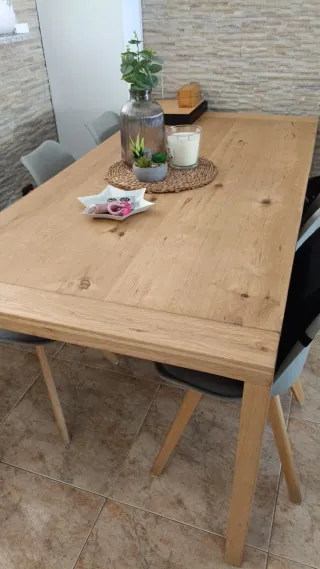 Mesa de comedor. -Medidas 90x90 extensible a 180x90. -Muy práctica, para 4 y extensible hasta para 8 comensales. - Patas de madera robustas.