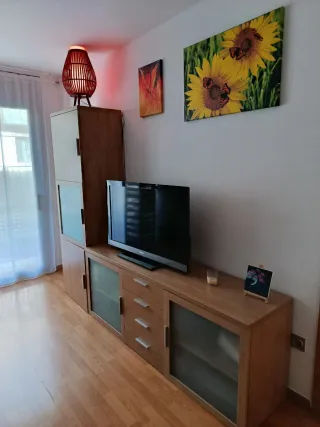 Mesa extensible comedor con 4 sillas y mueble para la television junto a un panel trasero de pared